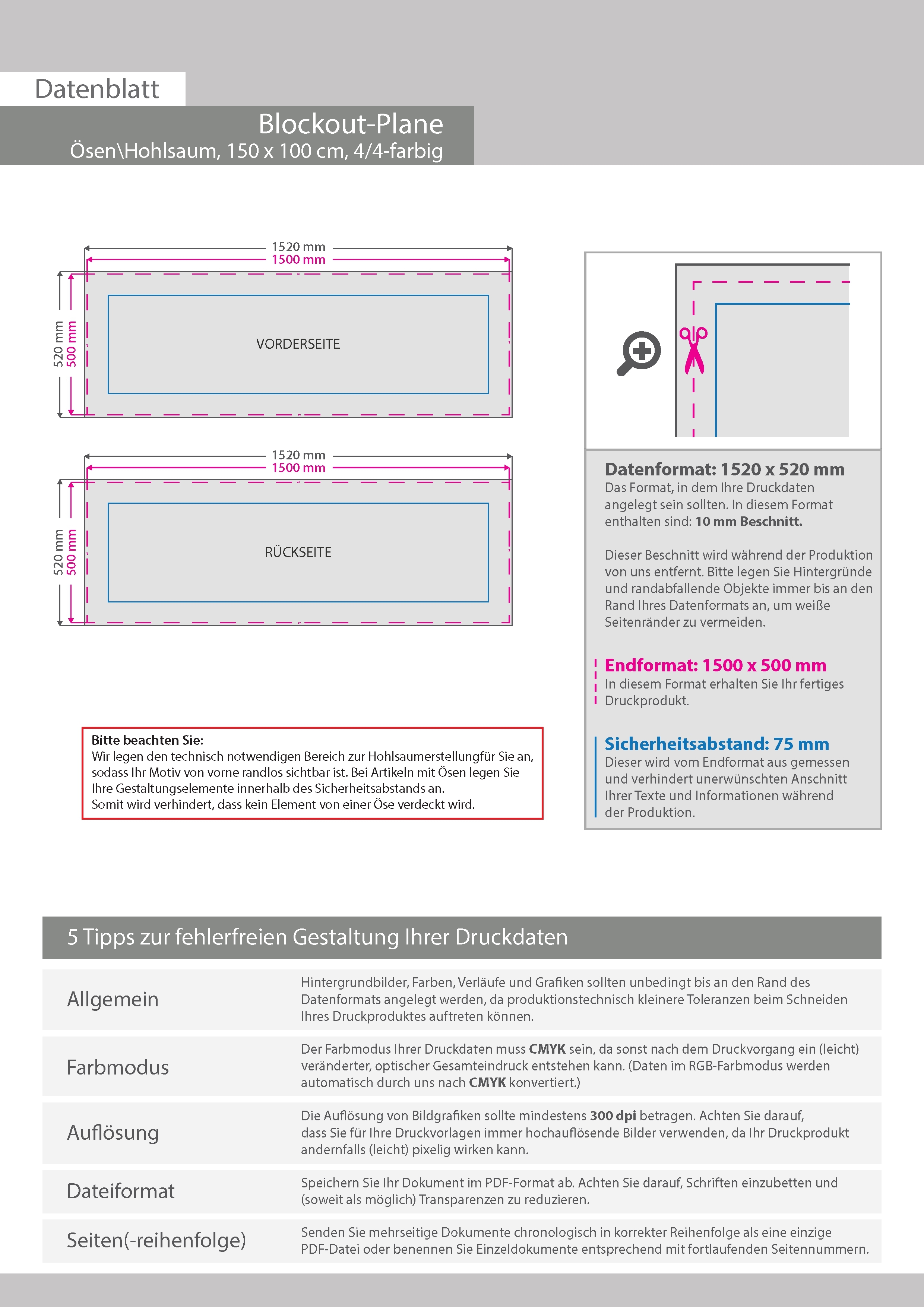 Hochwertige Blockout-Plane 150 x 50 cm, 4/4-farbig bedruckt, Ösen im Abstand von 50 cm rundum